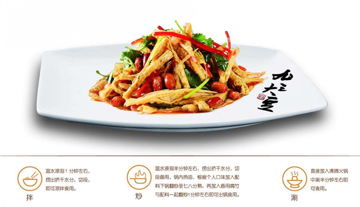 3、常规的烘干腐竹需要浸泡3-4个小时才可以食用,冻干腐竹只需要在温水中复水1分钟即可,吃火锅时只需在火锅中轻涮30秒,为喜食腐竹的人群实现了开袋即食的便捷。